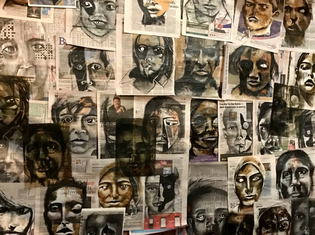 We can observe a compilation of black and white sketches, looking for simplicity and emphasis of each face. drawn in newspapers to connect the information and daily events in part of the life of each portrait. We can find different sizes, installed on a wall to invoke their individual history, like an altar. Raising questions about the absent and present and the brevity of the memory of each individual